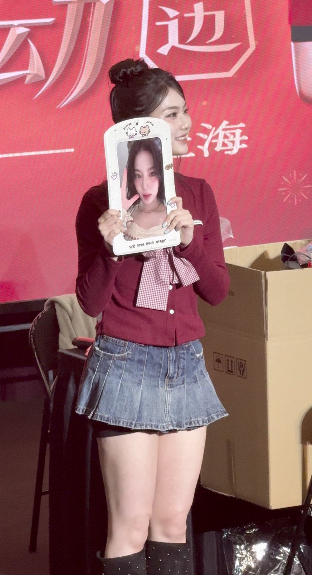아이사(Isa)는 버건디 컬러의 가디건과 데님 플리츠 스커트를 매치하여 하이틴 감성의 스타일리시한 룩을 완성했습니다. 다채로운 매력을 돋보이게 하는 프리미엄 럭셔리 무드와 캐주얼한 아이템의 조화가 돋보입니다.