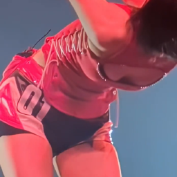 Ryujin completes an energetic performance look by matching a lace-up detail crop top in an intense red color with sporty shorts. This outfit is composed of premium items that emphasize a high-end street mood, showcasing a striking and luxurious style.