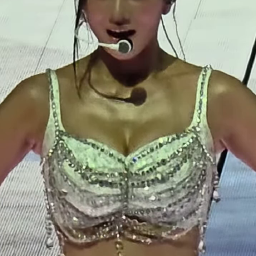 지효는 화려한 비즈 장식이 돋보이는 크롭 탑으로 무대 위에서 독보적인 존재감을 드러냅니다. 이번 럭셔리 스타일링은 고단가 아이템인 크리스털 장식 의상을 활용하여 무대 분위기를 극대화하며 완벽한 실루엣을 강조합니다.