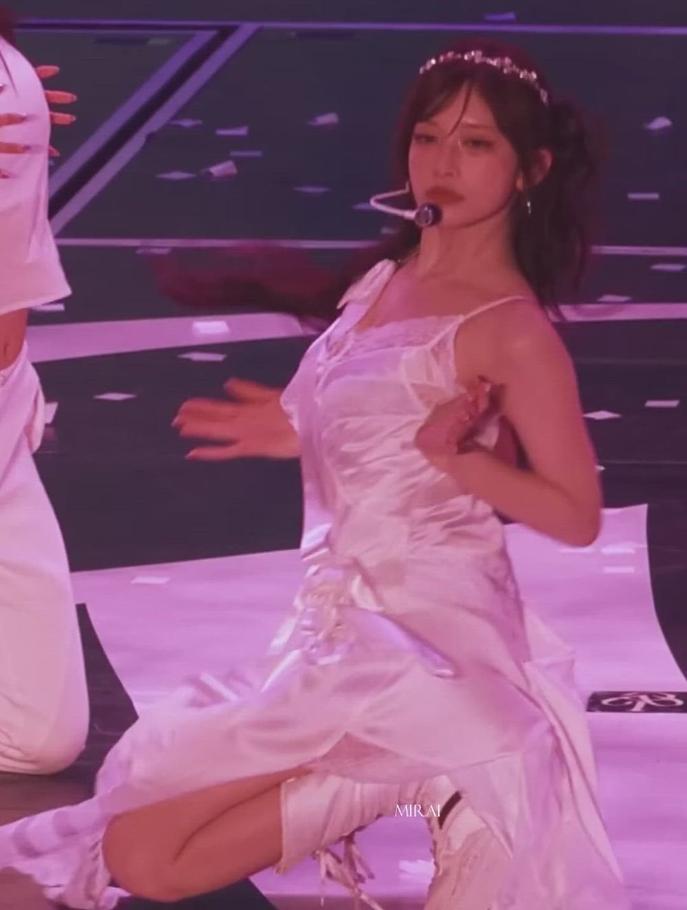 Leeseo showcases a romantic and elegant style with a white slip dress that exudes a sophisticated aura on stage. The combination of luxurious silk fabric and delicate lace details completes Leeseo's high-end mood, highlighting a polished look through the use of premium luxury items.