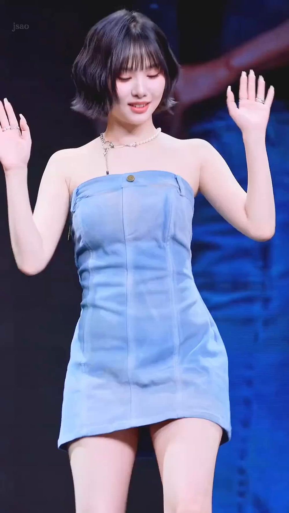 Eunha wears a bright blue tube top mini dress, creating a refreshing and sophisticated vibe. This style, highlighted by the denim texture, exemplifies high-end idol fashion and completes a luxurious look with a statement necklace.