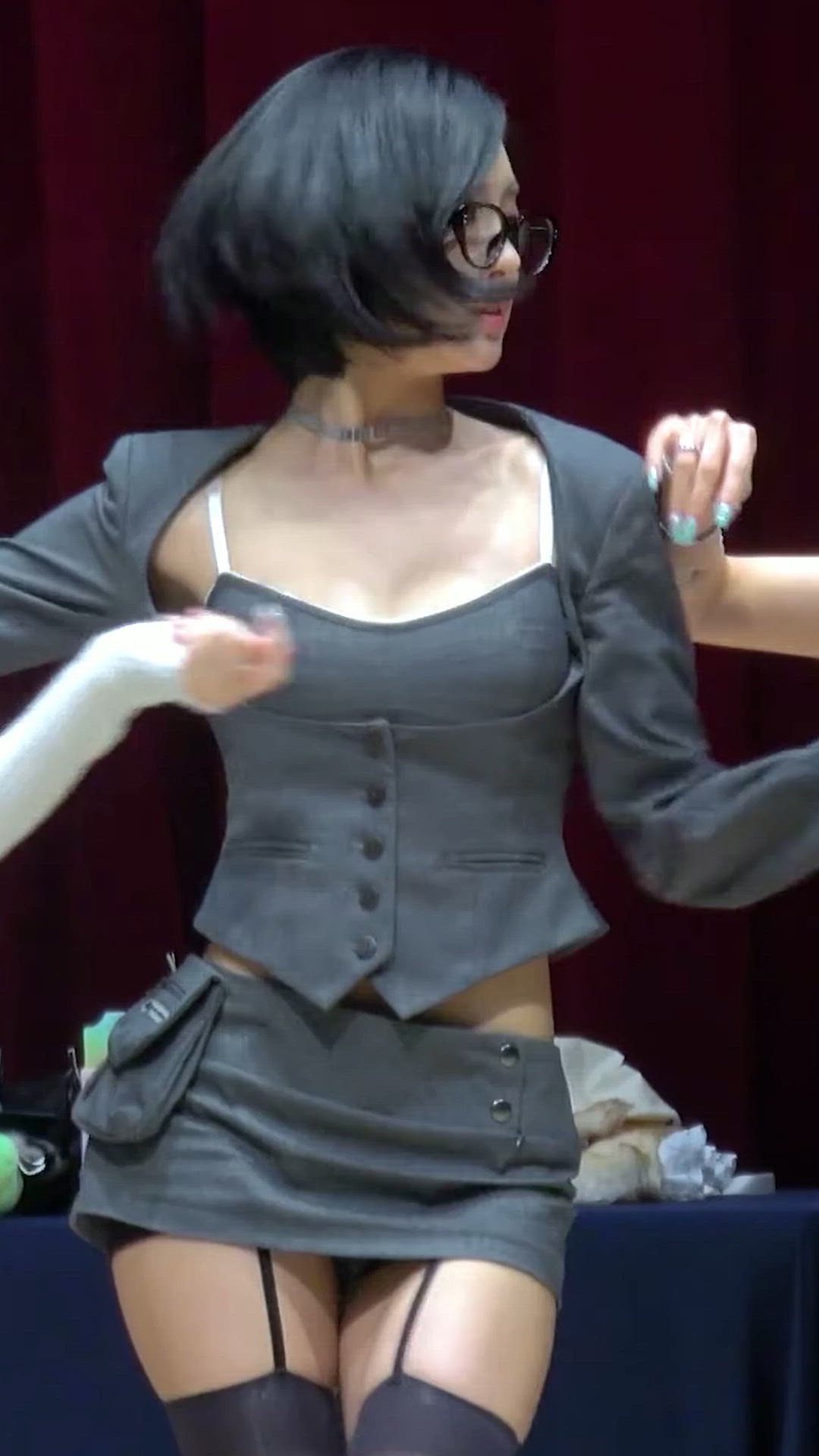 Dayeon showcases an urban and modern charm through a sophisticated setup style. The look, combining a gray vest and a jacket, creates a luxurious atmosphere, while the addition of garter belt details and thick-rimmed glasses completes her unique fashion statement.