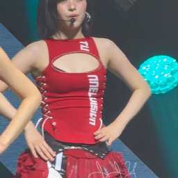 Ryujin exudes an unrivaled charisma on stage by utilizing intense red as the main color. The combination of a top with cutout details and a layered skirt completes a luxury street mood, further highlighting Ryujin's energetic performance.