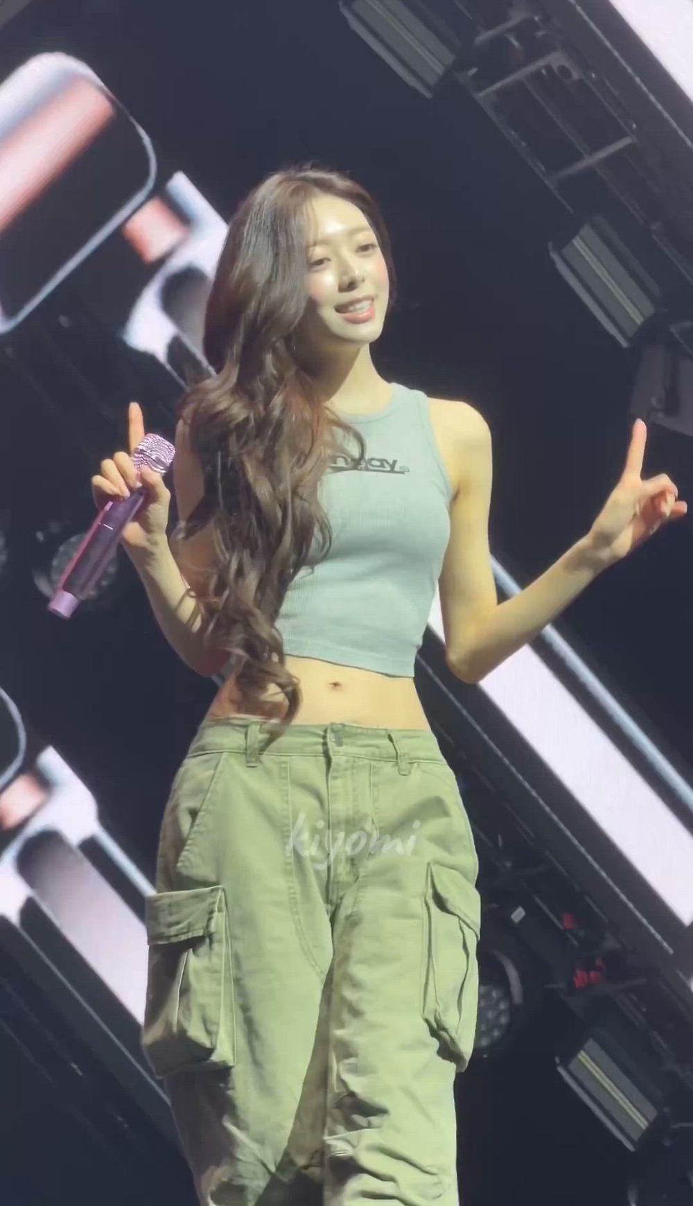 ITZY - Yuna 패션 분석 유나는 그레이 컬러의 크롭 슬리브리스와 카키색 카고 팬츠를 매치하여 활동적이…