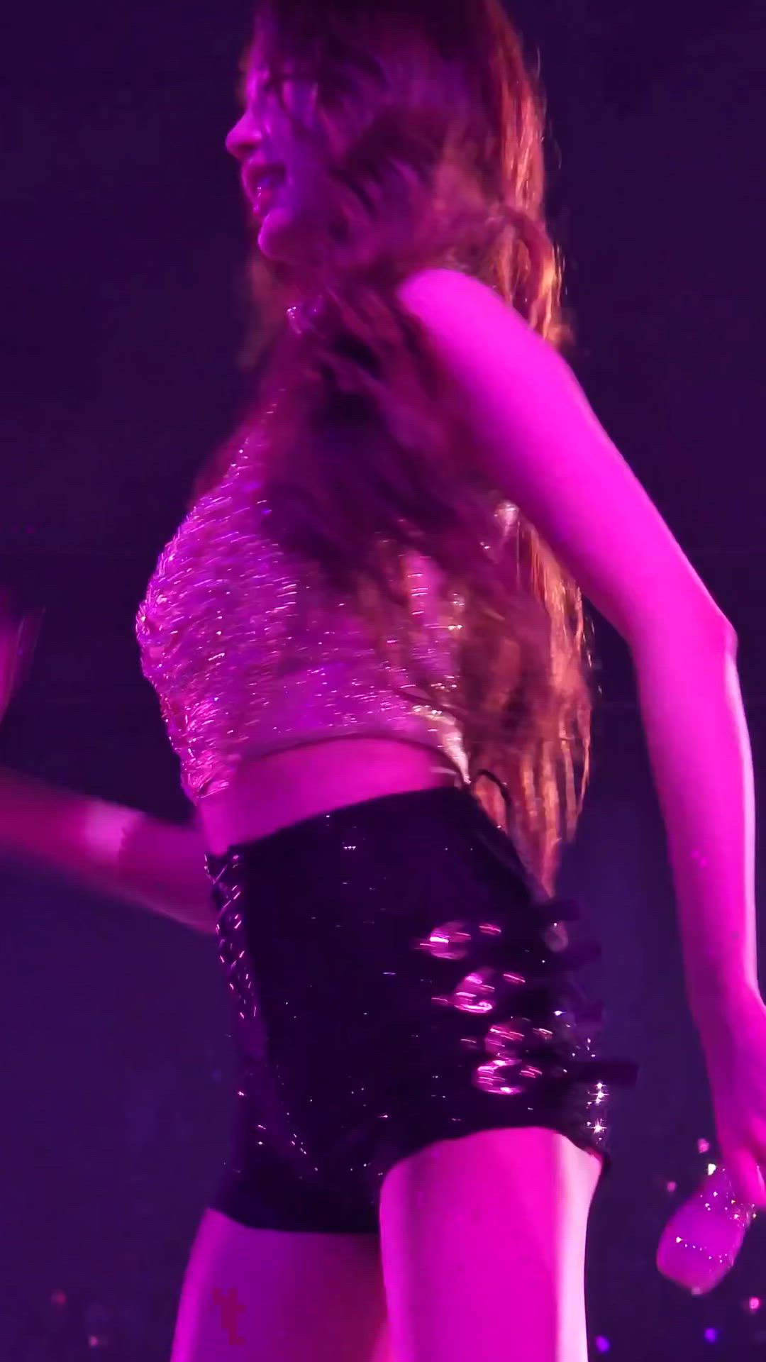 IVE - Wonyoung 패션 분석 IVE 원영은 화려하고 반짝이는 글리터 크롭탑과 블랙 숏팬츠를 매치하여…