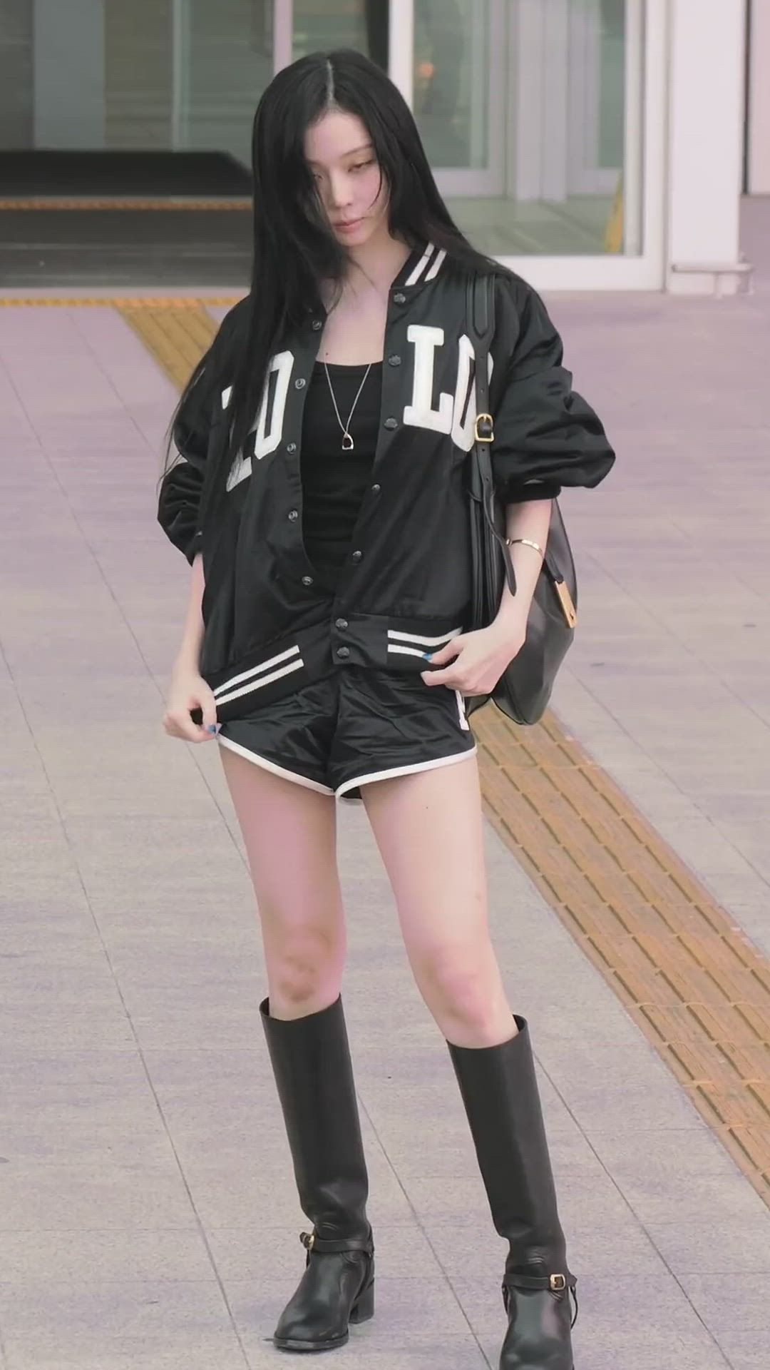 aespa - Winter 패션 분석 윈터는 검은색 바시티 재킷과 쇼츠를 매치한 스포티하면서도 세련된 룩을 …