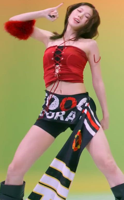 LE SSERAFIM - Eunchae 패션 분석 은채는 강렬한 레드 컬러의 상의와 블랙 미니 스커트, 그리…