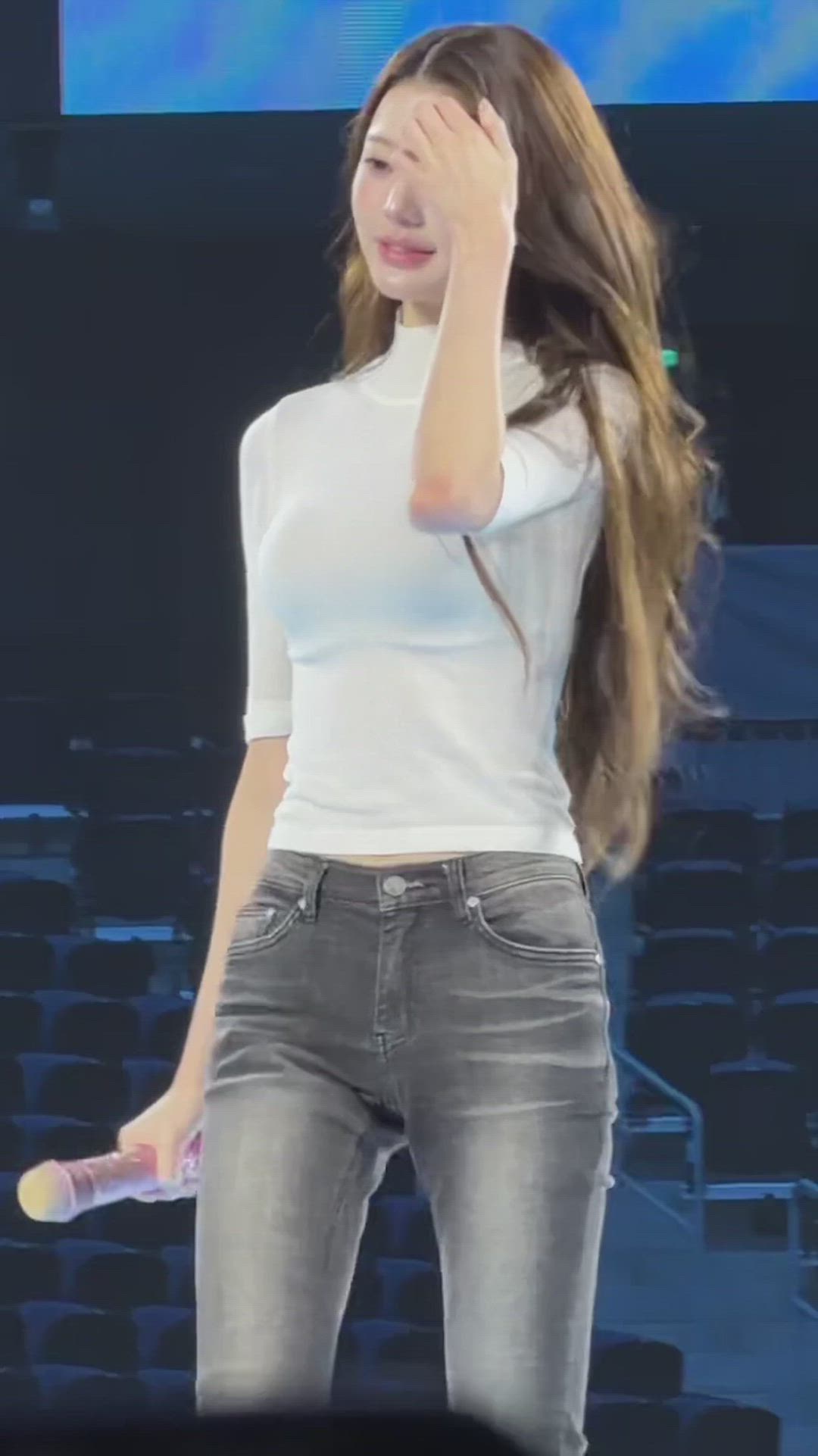 IVE - Wonyoung 패션 분석 장원영은 깔끔한 흰색 터틀넥 상의와 워싱된 다크 그레이 데님 팬츠를 매…