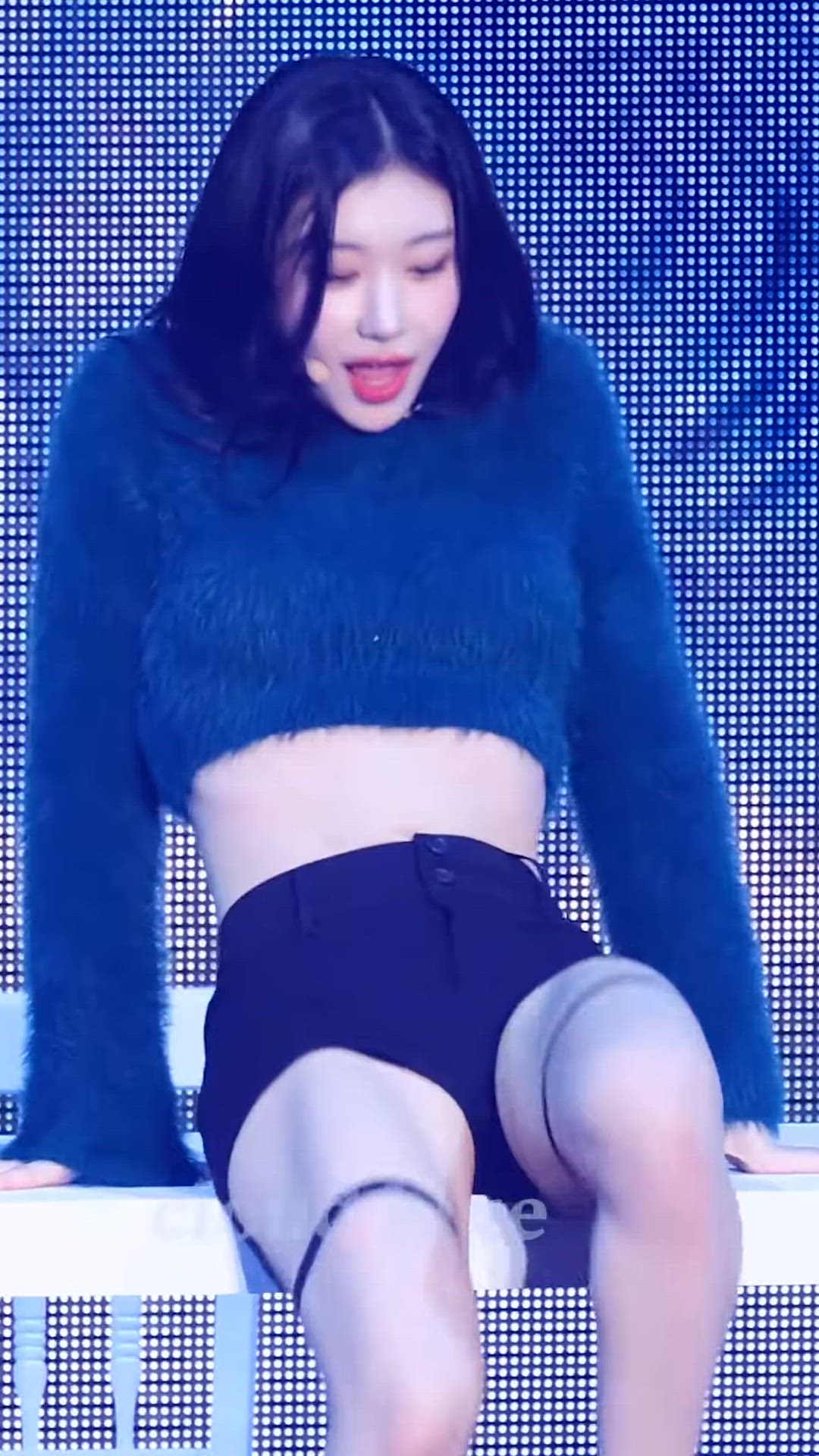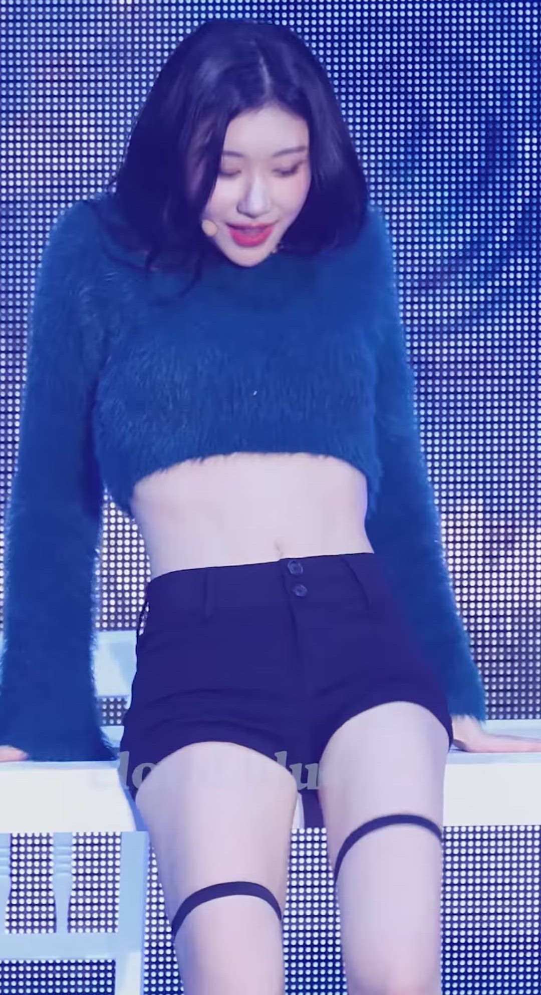 Chaeryeong - ITZY 패션 분석 채령은 무대 위에서 크롭 퍼 니트 스웨터와 하이웨이스트 블랙 숏츠…