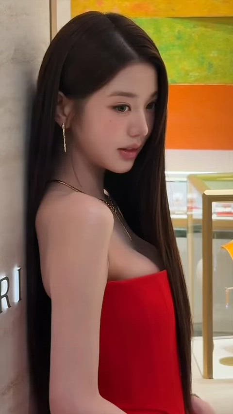 GIF-Wonyoung - IVE 패션 분석 원영은 강렬한 레드 컬러의 스트랩리스 드레스를 착용하여 세련된 …