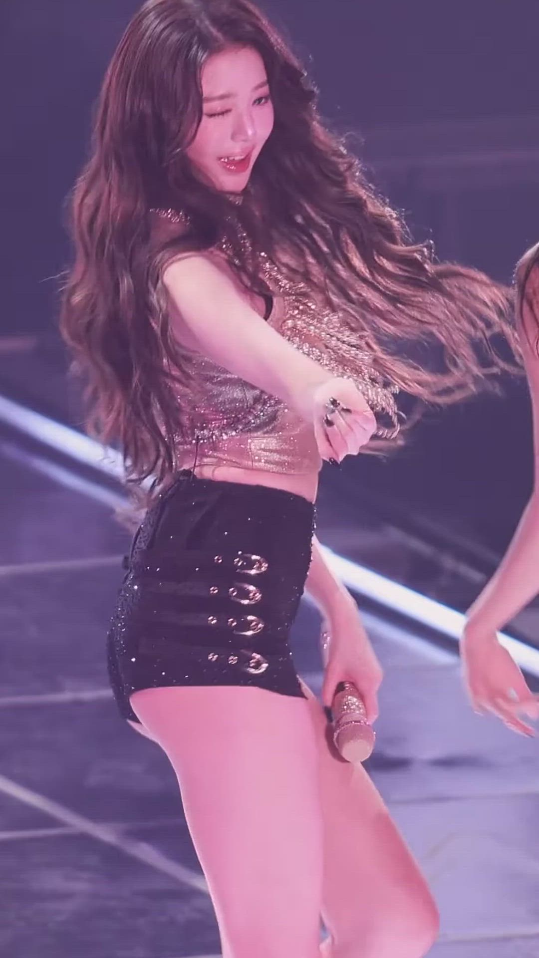 IVE - Wonyoung 패션 분석 장원영은 반짝이는 골드 크롭 상의와 블랙 미니 하의를 매치하여 화려한 …