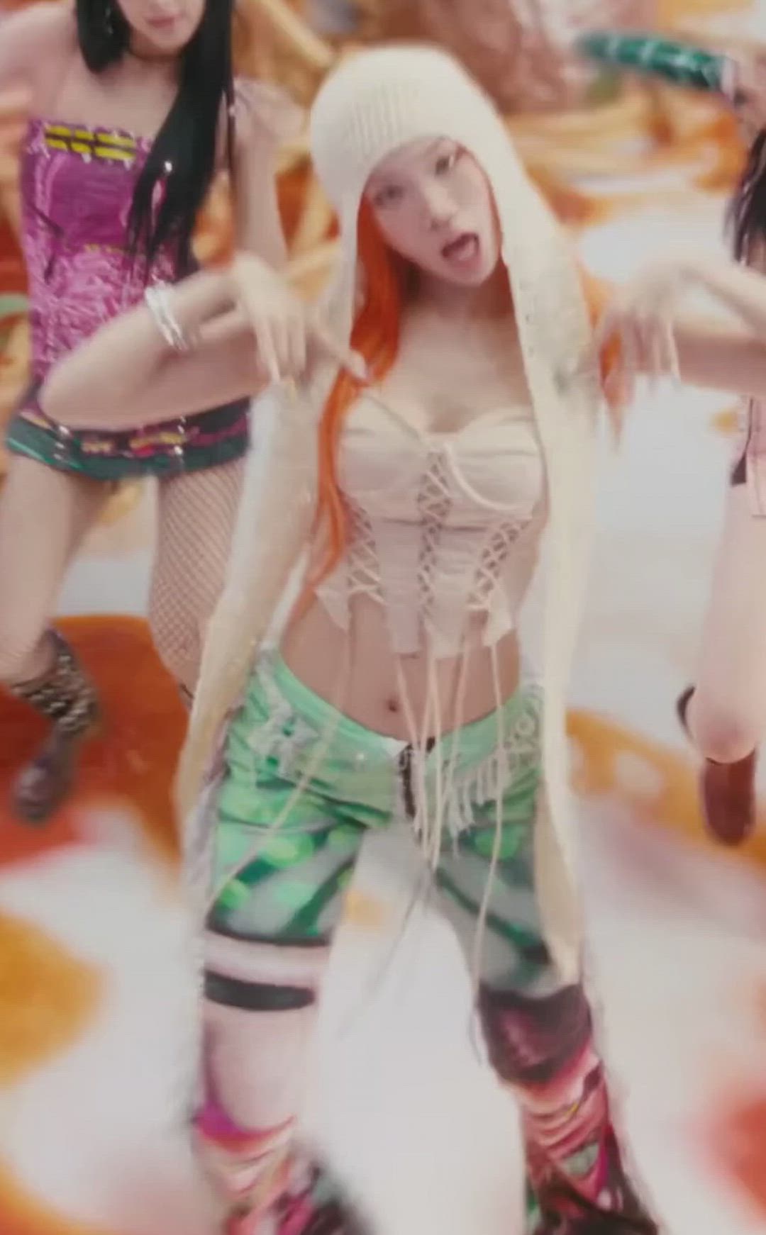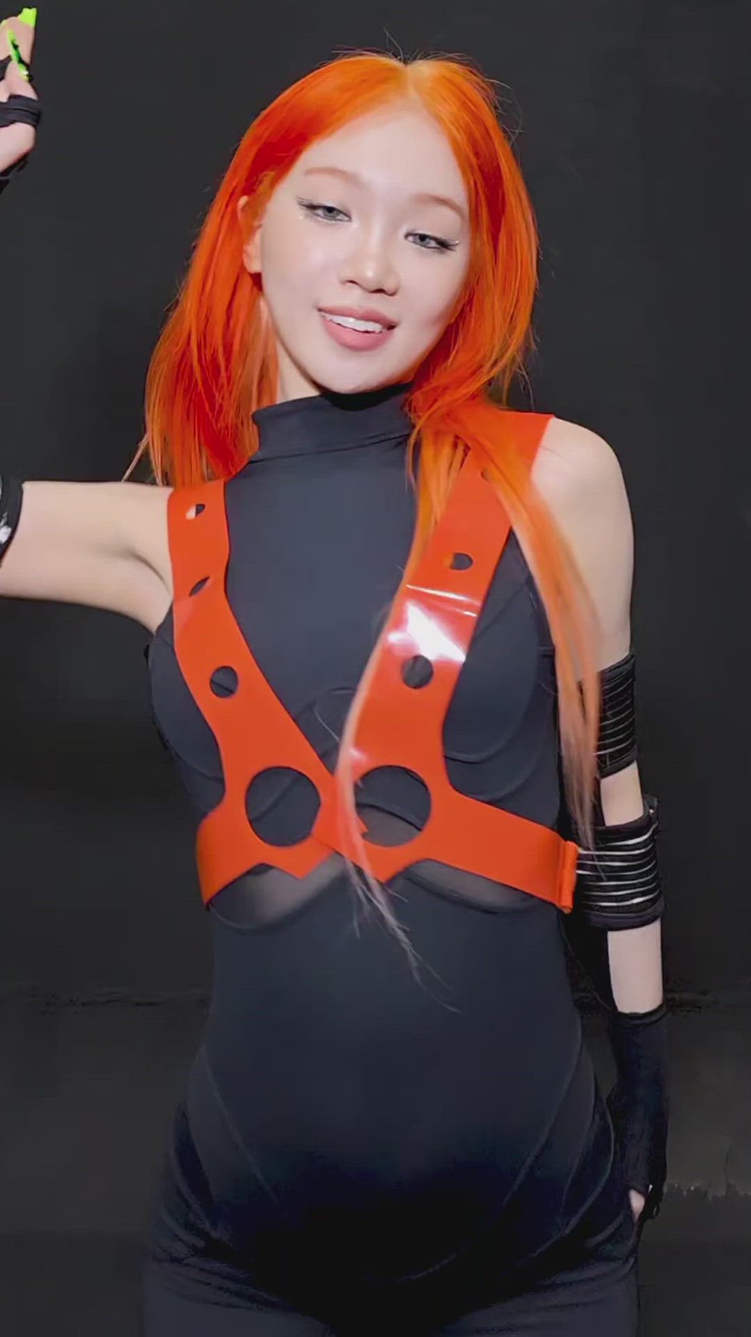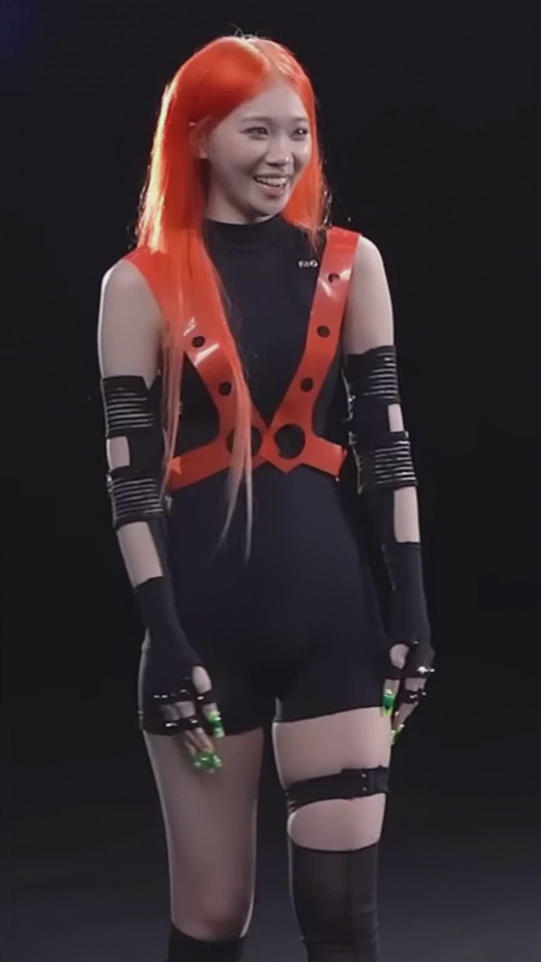 LESSERAFIM-Chaewon 패션 분석 르세라핌 김채원은 강렬한 오렌지색 헤어스타일과 조화되는 대담하고…