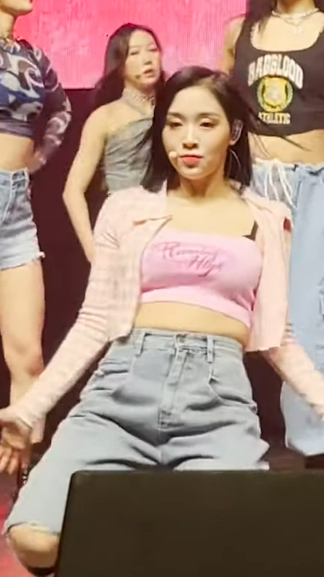 Dreamcatcher - Gahyun 패션 분석 가현은 핑크색 크롭탑과 연청색 와이드 팬츠를 매치하여 트렌…