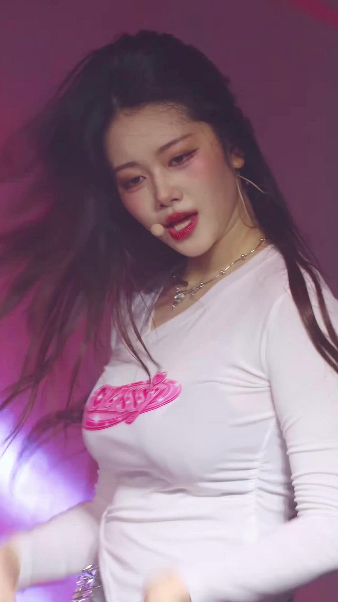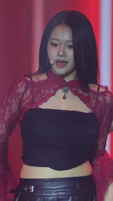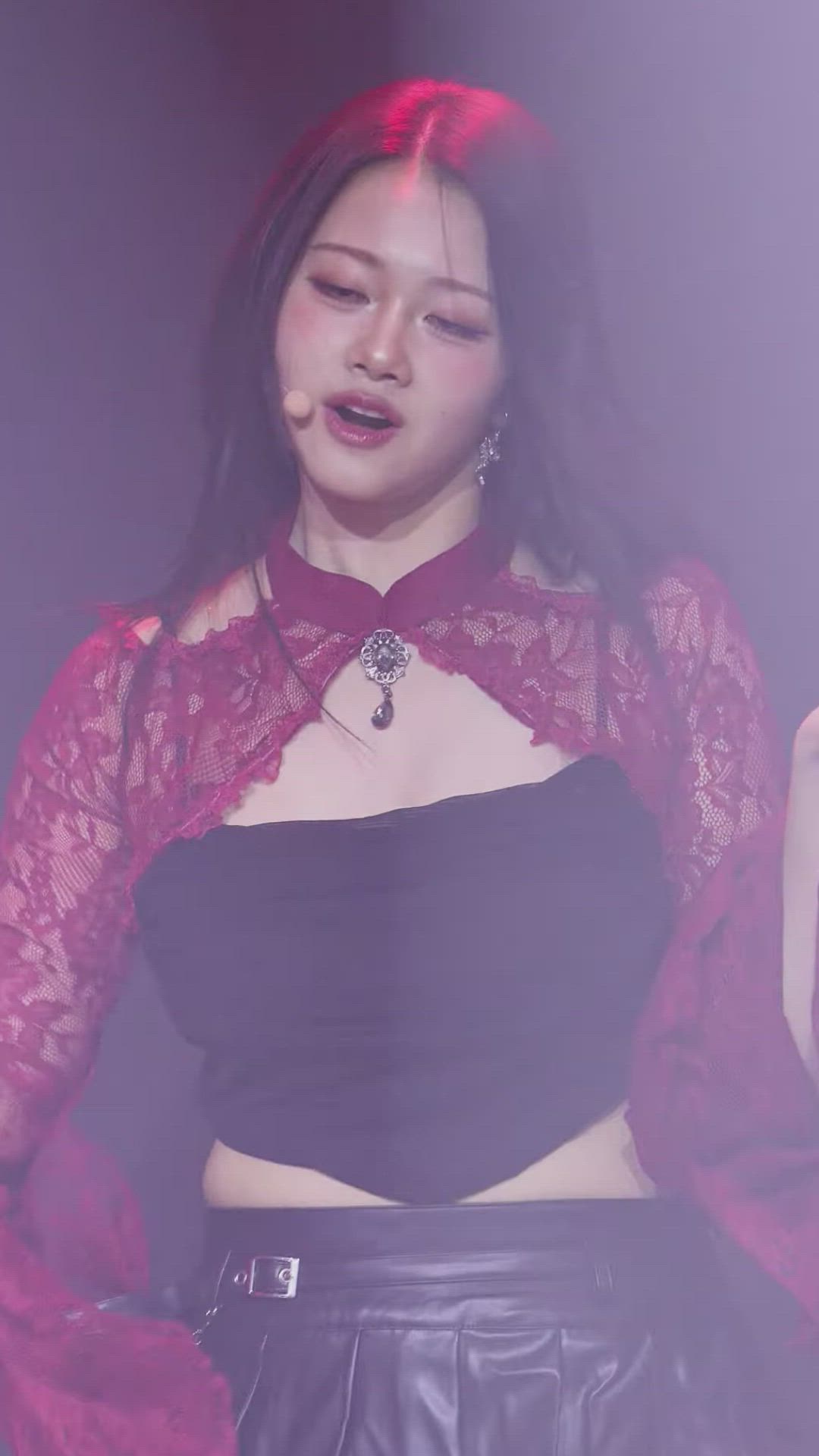 CLASS:y - Jimin 패션 분석 원지민은 강렬한 퍼포먼스룩을 선보이고 있습니다. 검은색 튜브톱과 버건…