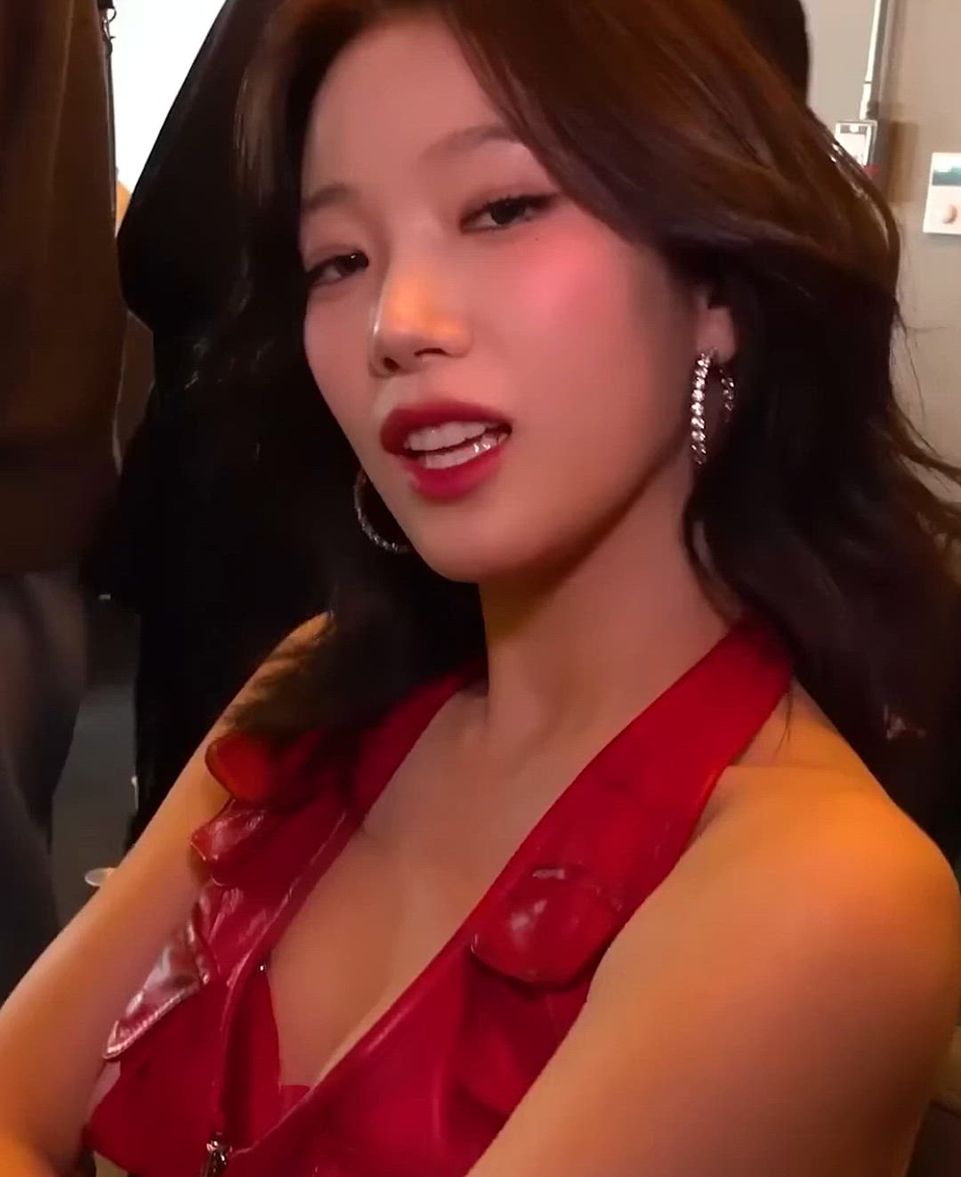 Kazuha - LE SSERAFIM 패션 분석 카즈하는 고급스러운 강렬한 레드 컬러의 홀터넥 상의를 착용하…