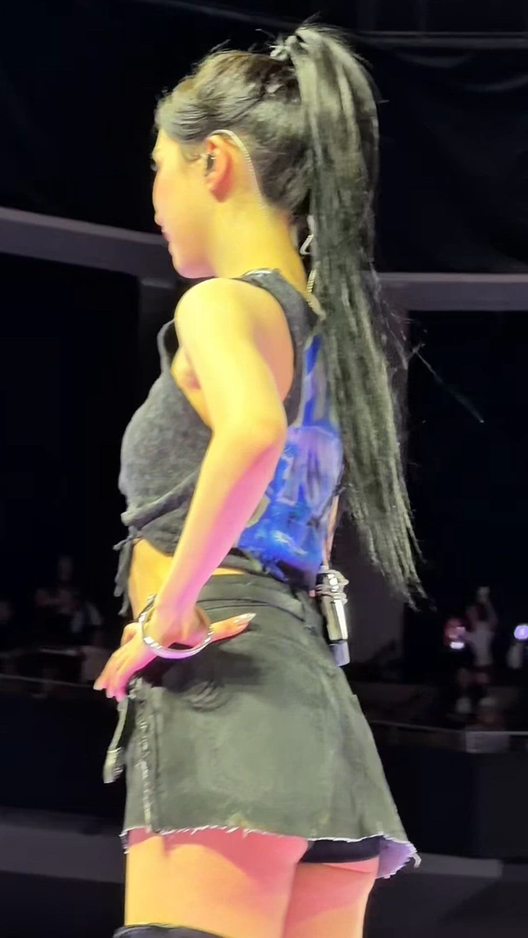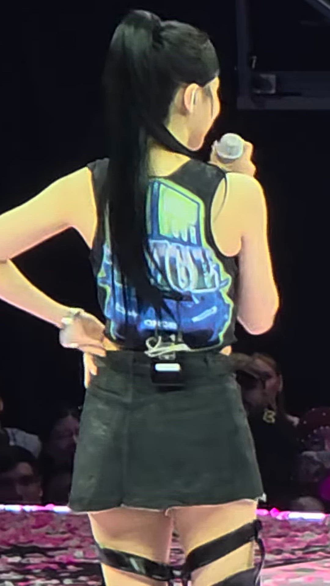 GIF-Karina 패션 분석 카리나는 하트 그래픽이 돋보이는 크롭 탑과 강렬한 블랙 레더 스커트를 매치하여…