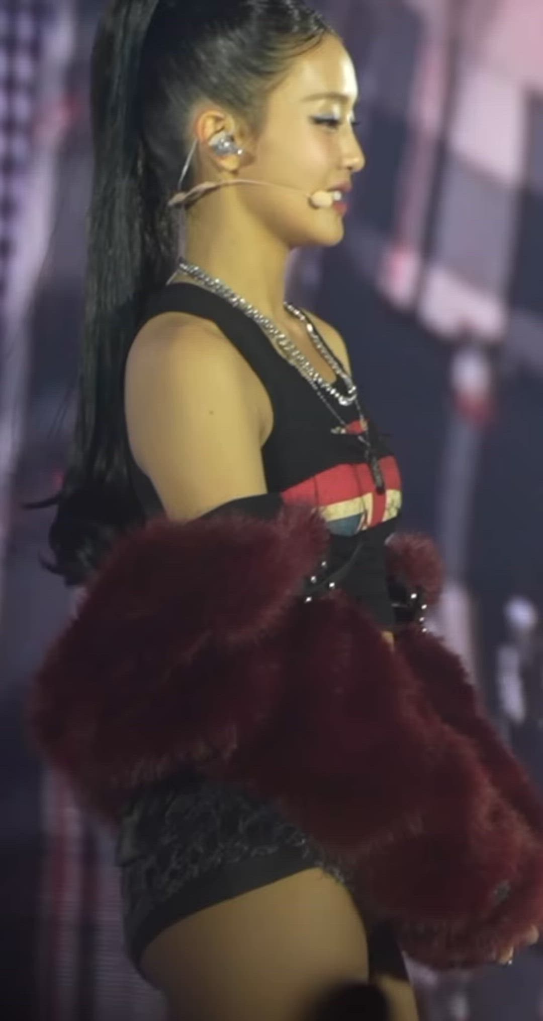 GIF-Minnie 패션 분석 민니는 강렬한 레드 조명 아래에서 글래머러스한 매력을 발산하는 무대 의상을 선…