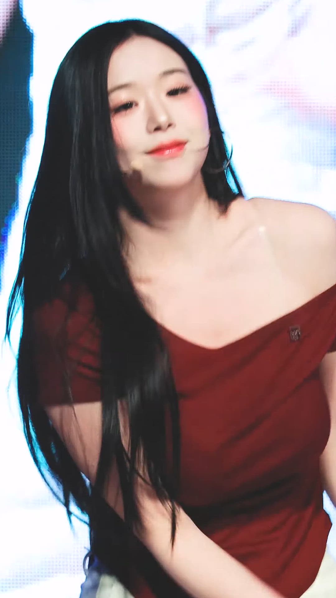 tripleS - Chaeyeon 패션 분석 채연은 무대에서 매혹적인 분위기를 연출하는 버건디 오프숄더 상의…